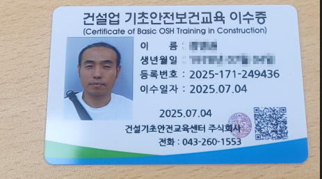 다음 주부터 아파트 공사 현장에서 근무할 예정이라 필수 조건인 기초안전보건교육 이수증을