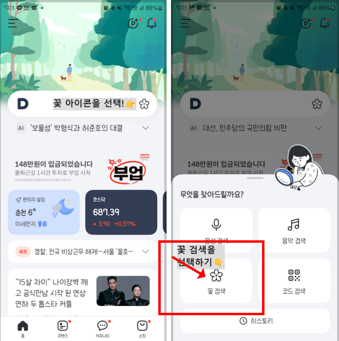 ✅ 1단계: 다음 앱 실행 후 ‘꽃 검색’ 기능 찾기