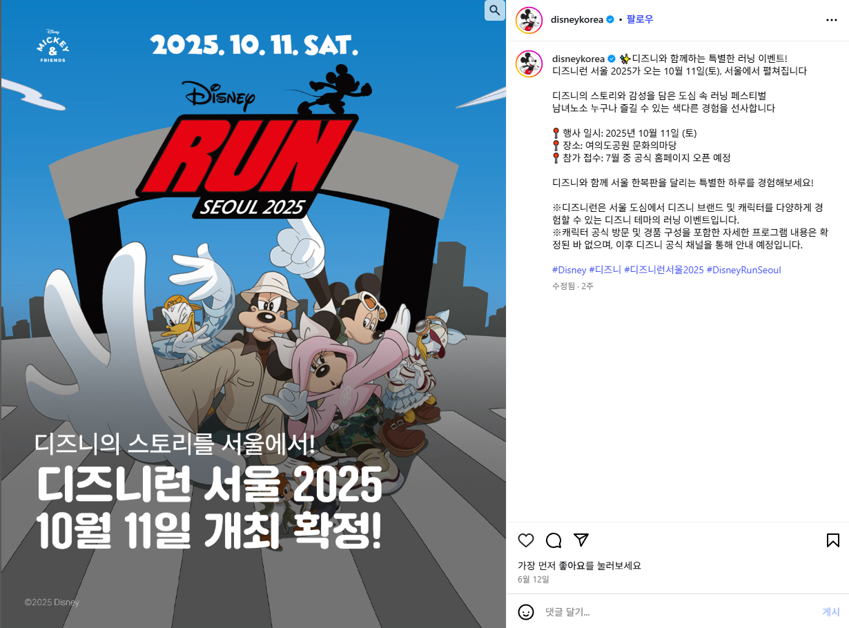 디즈니런 서울 2025 참가 예매는 공식 인스타그램 계정(@disneykorea)과 공식 홈페이지,