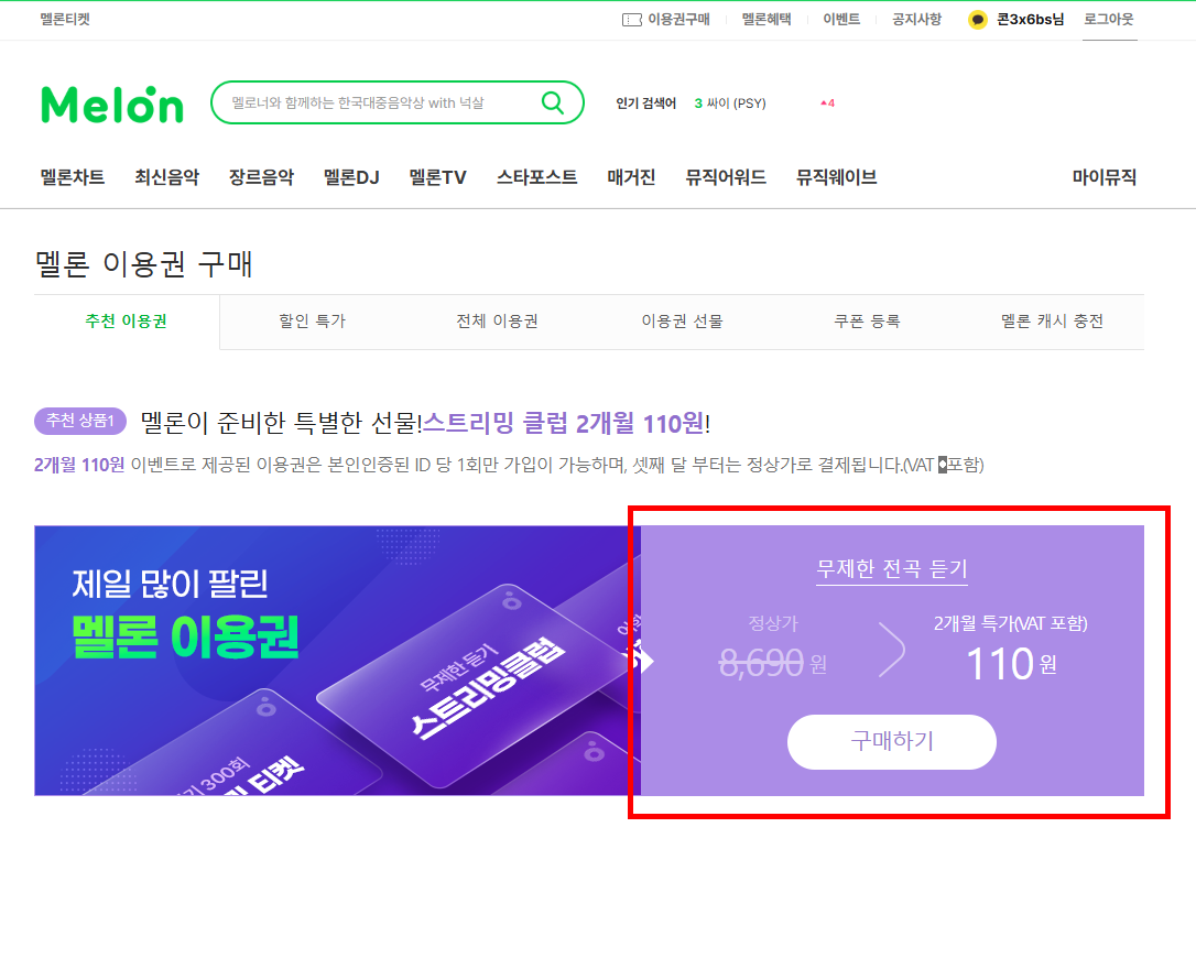 여기서 멜론 이용권이 보이면