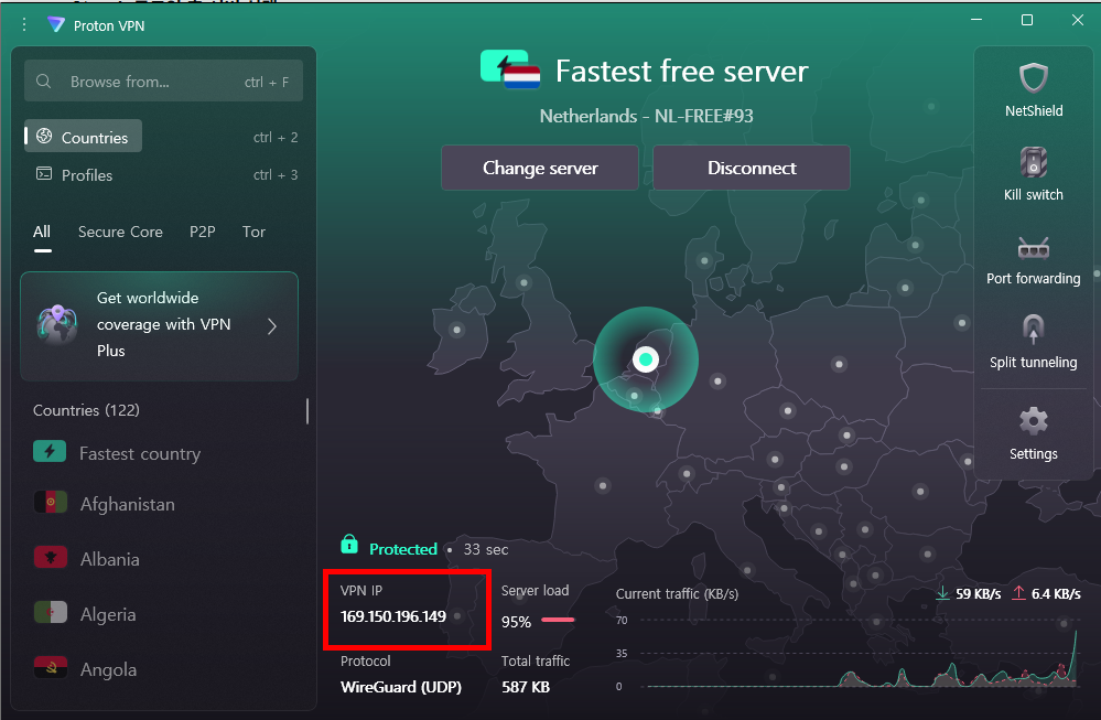 - "Quick Connect" 또는 "Countries" 메뉴에서 원하는 국가 클릭
