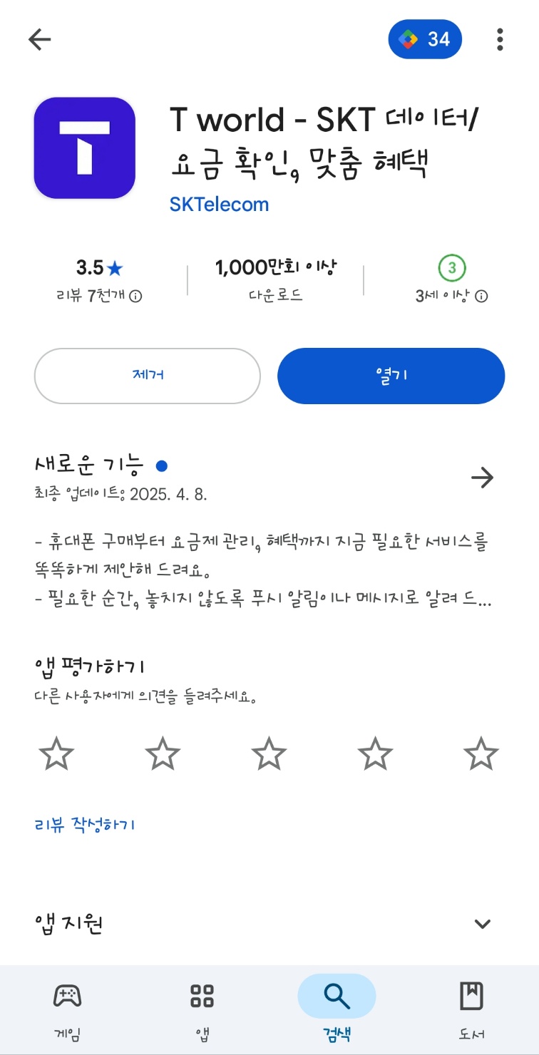 1.핸드폰에서 Play 스토어 실행후 티월드 검색 - 티월드 열기