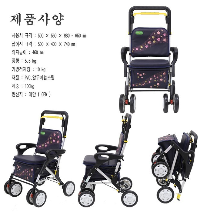 - 특징: 알루미늄 프레임, 손잡이 브레이크 고정장치, 야간 반사테이프, 3단 각도 조절 앞바퀴