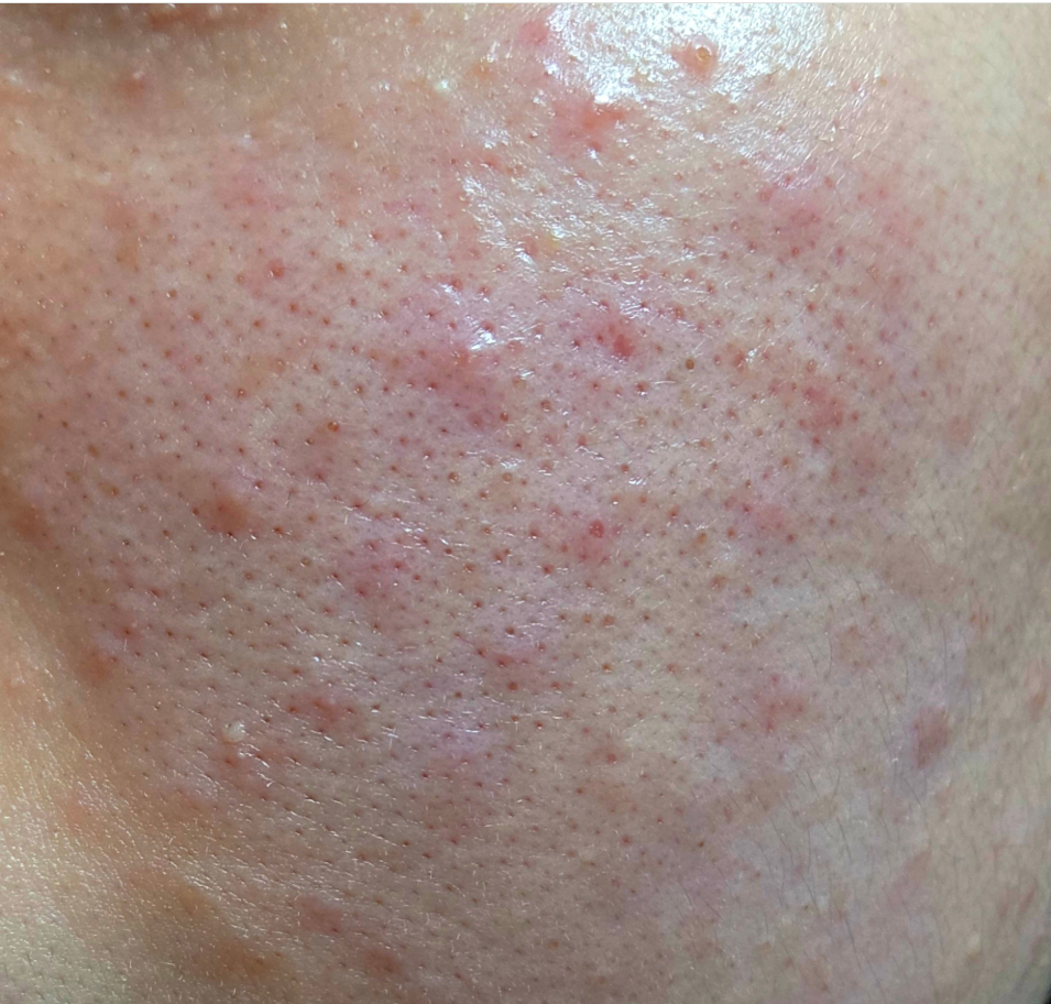 - 붉은 염증성 여드름이 섞여 있고