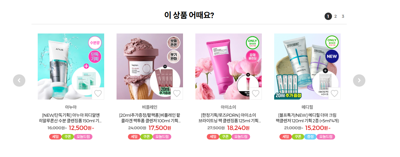 | 추천제품 | 재구매템, 스킨케어, 생활용품 | 색조, 향수, 기초 처음 써보는 제품 |