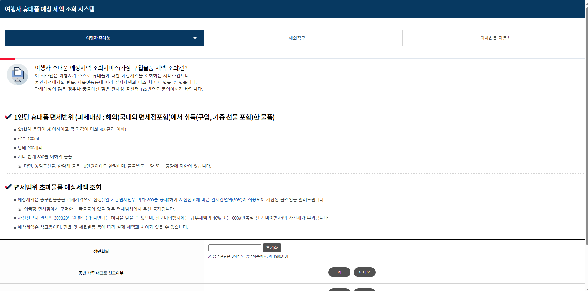 👉 관세청 휴대품 예상 세액 계산기에서