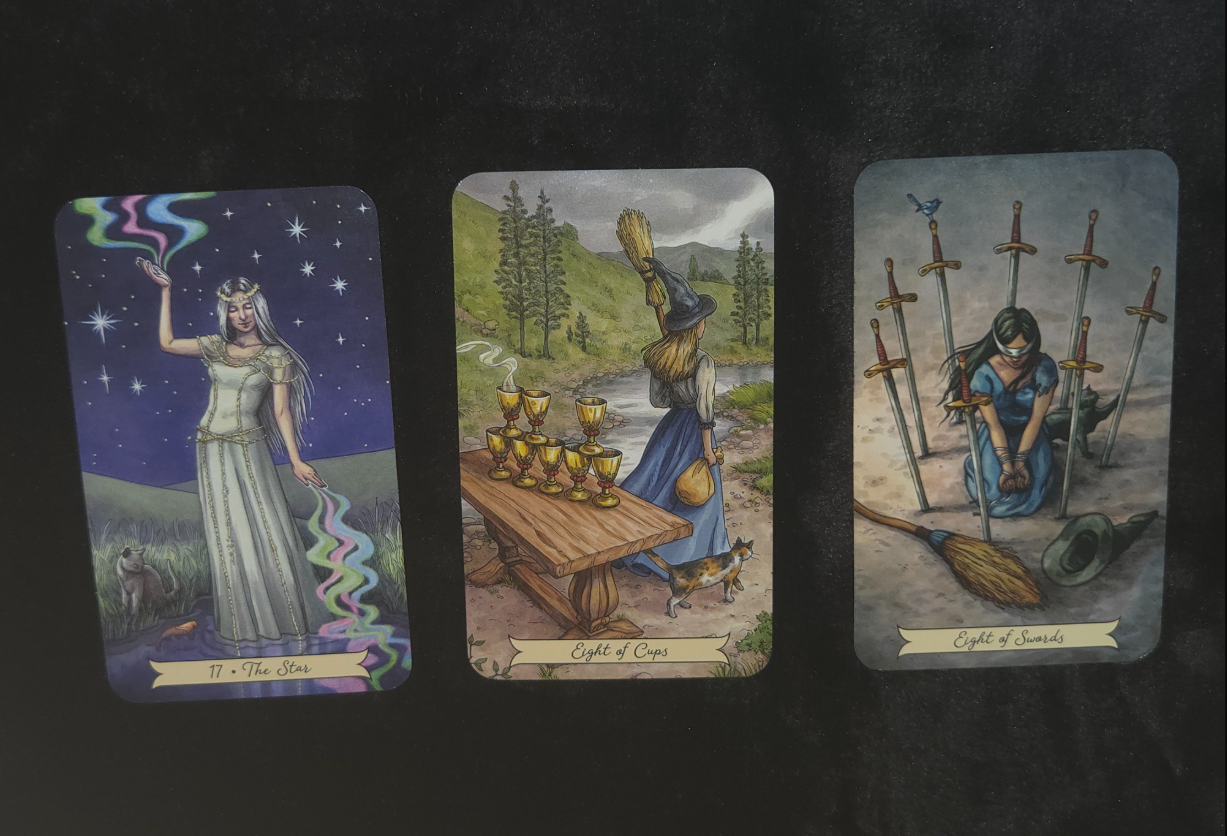 세 장의 카드 — The Star(별), Eight of Cups(컵 8), Eight of Swords(소드 8) — 이 전해주는 사랑의 흐름을 함께 읽어볼게요.