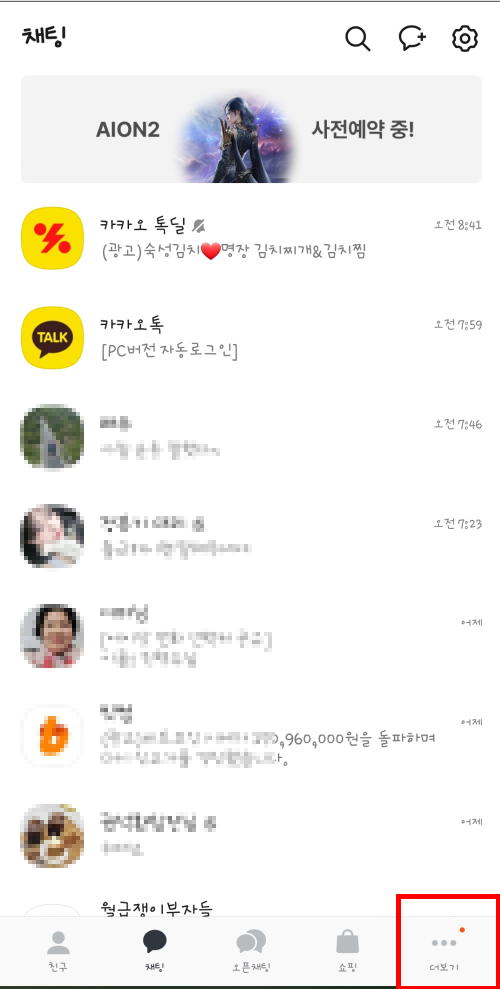 - 카카오톡 실행 → 더보기(점 3개) 클릭