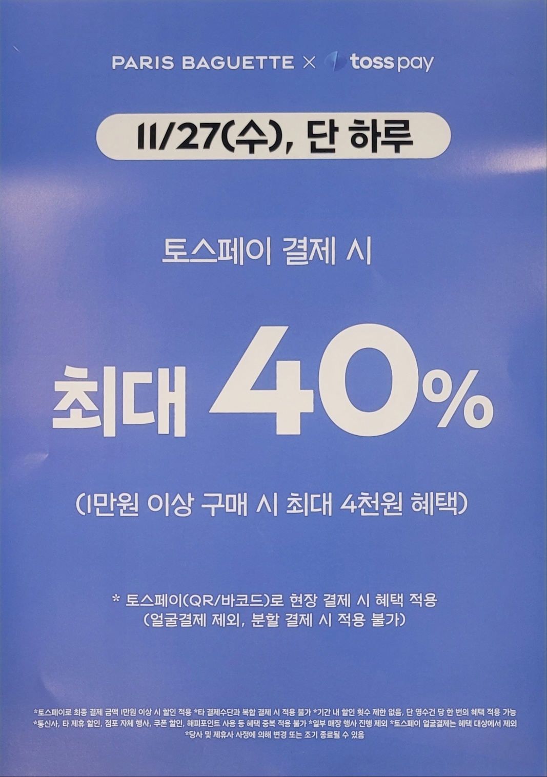 파리바게트 X 토스페이 결제시 최대 40% 할인 11/27,단 하루