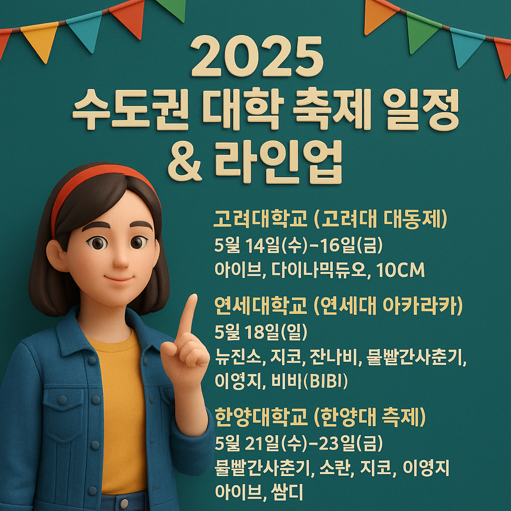 이번 포스팅에서는 2025년 수도권 대학 축제 일정과 라인업 정보를 학교별로 정리하여 소개합니다.
