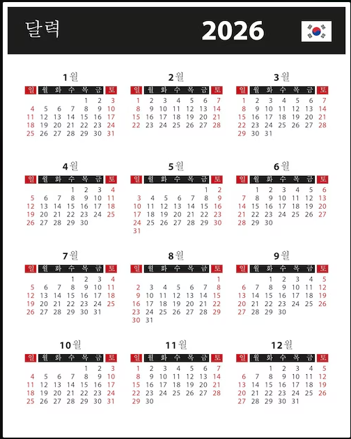 2026년 공휴일 캘린더