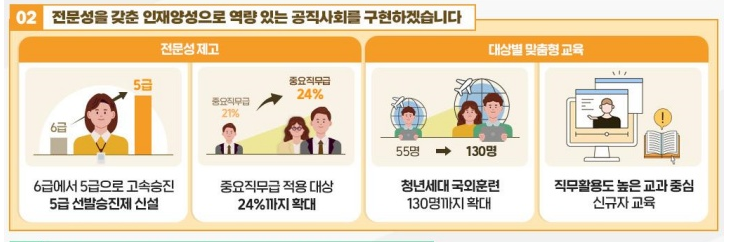 또한 퇴직 공무원의 전문성을 활용한 사회공헌 프로젝트도 추진되며, AI 기반의 인사시스템 도입을 통해 미래 환경 변화에 유연하게 대응하는 체계를 구축합니다.