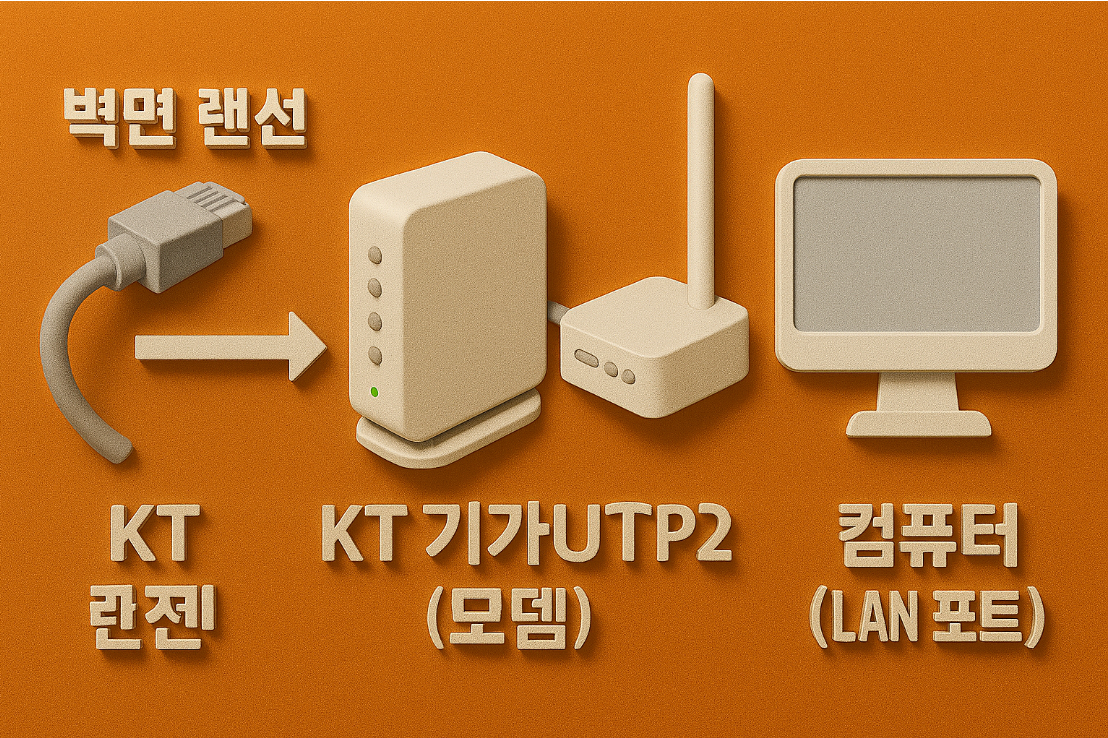 - 벽면 랜선 → KT 기가UTP2(모뎀) → ipTIME 공유기(WAN 포트) → 컴퓨터(LAN 포트)로 연결