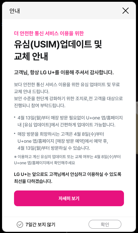 | 3월 30일 ~ 4월 7일 | LG U+에서 안내 문자 순차 발송 중 |